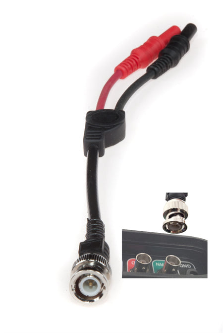 Connect the AES# 08-88-m Flexible Adapter to any scope or meter that uses BNC inputs. The other end connects to amp probes and other test accessories that terminate to a Banana-plug.