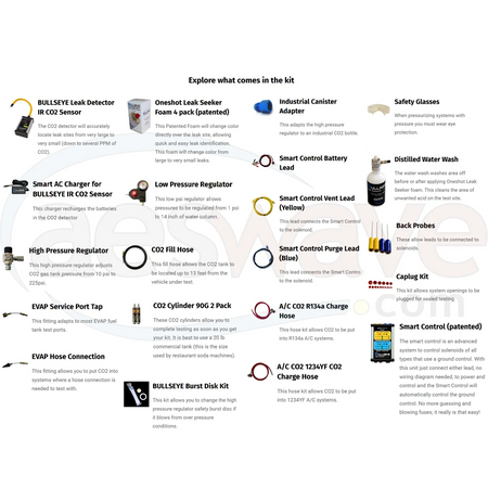Finds leaks in EVAP systems, A/C systems, engine cooling systems, head gaskets, tires and wheels, air ride suspensions, air brakes, and much more...